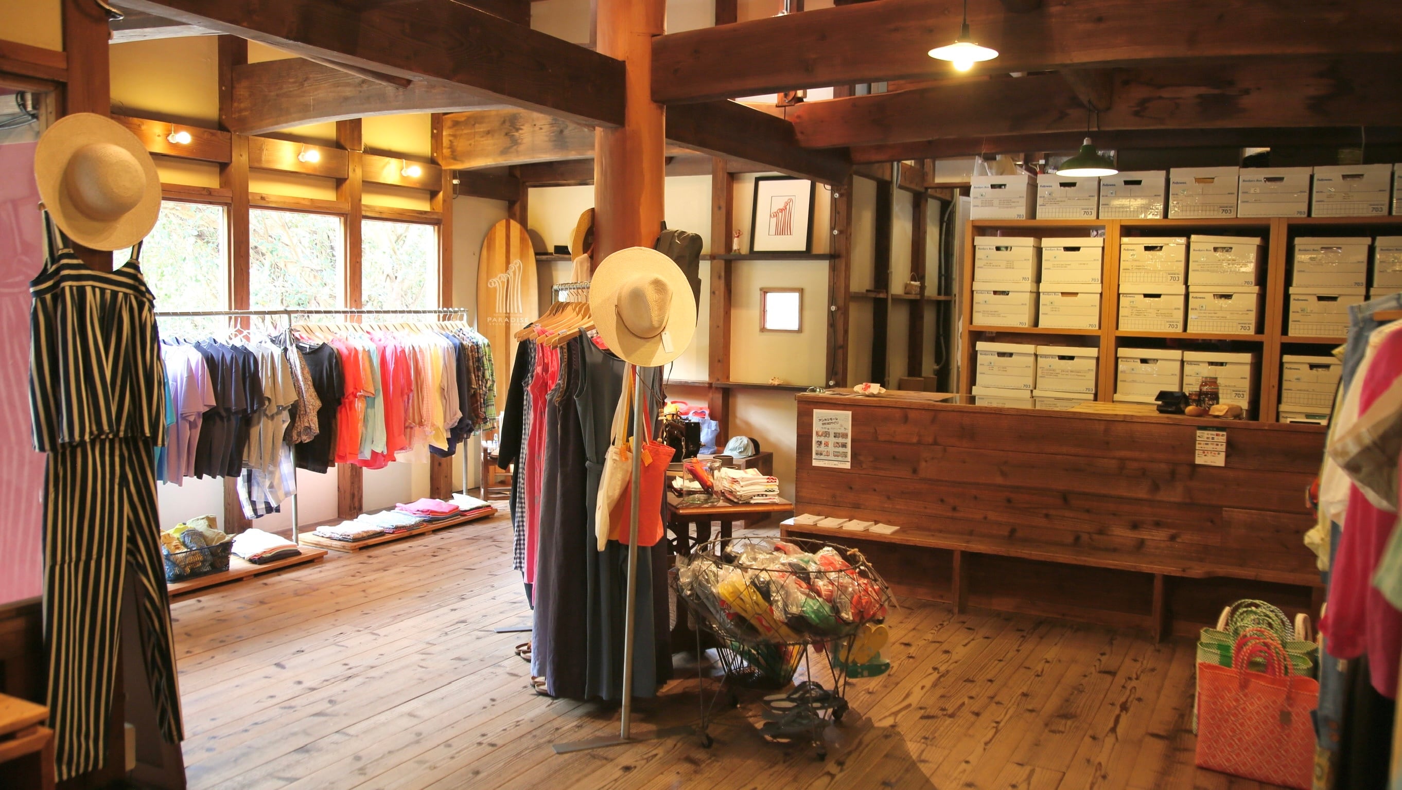 PARADISE STOREは、葉山にある「SUNSHINE+CLOUD」を本店に、代官山の「G.O.D.」、そしてここ奄美「PARADISE STORE」と、3つのお店を展開しているアパレルショップです。